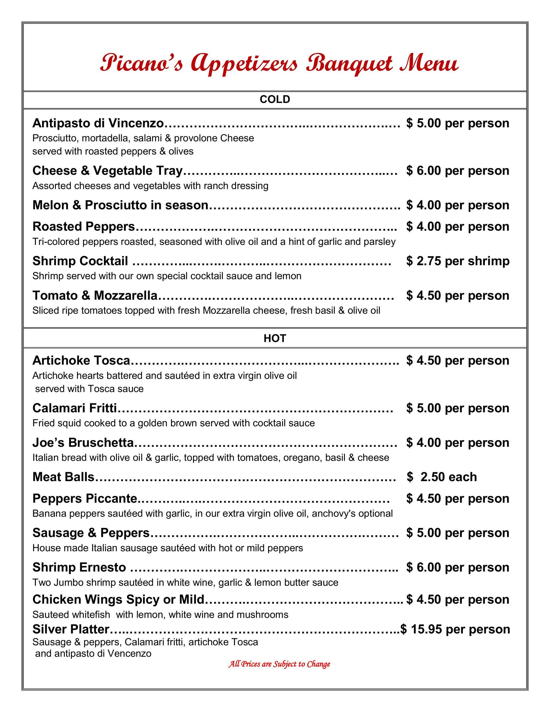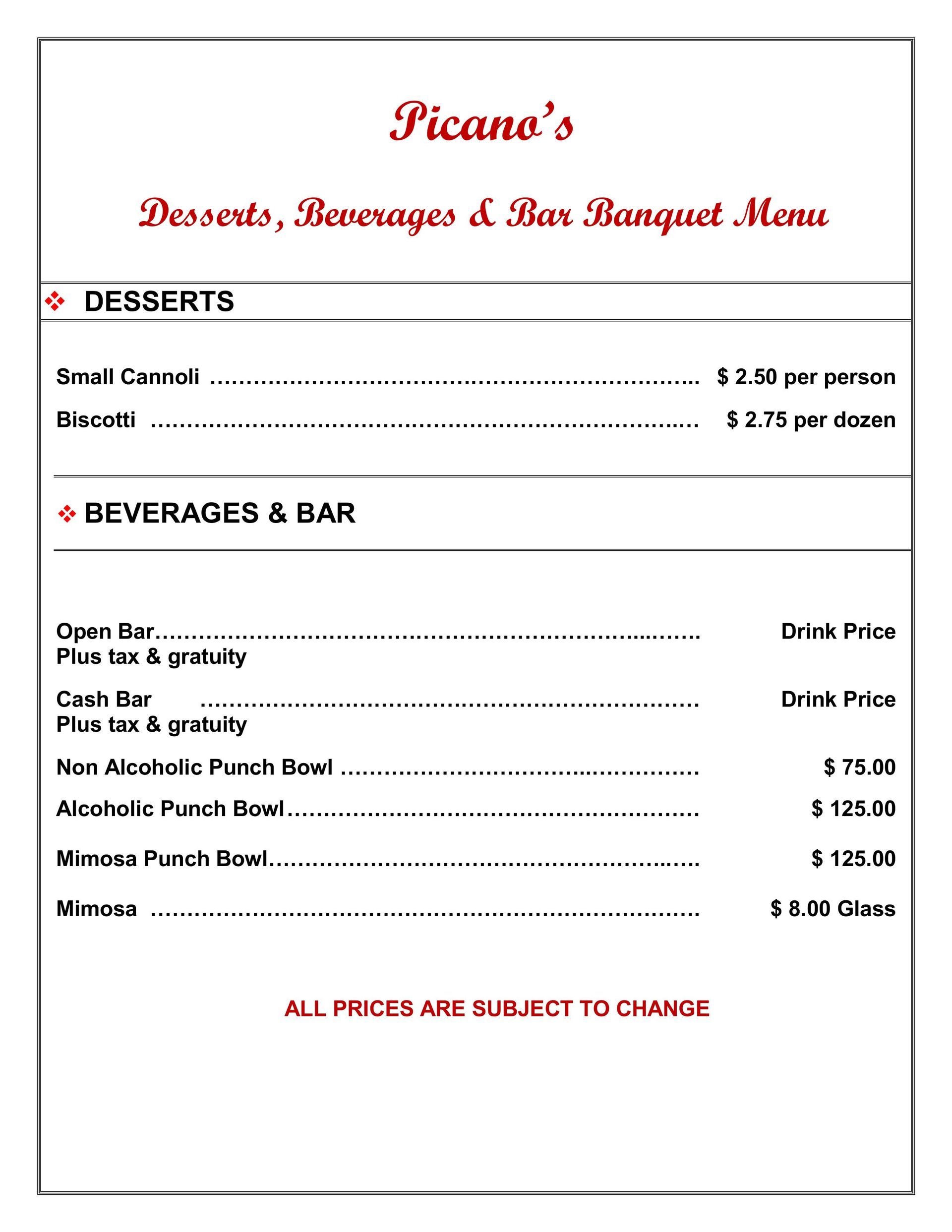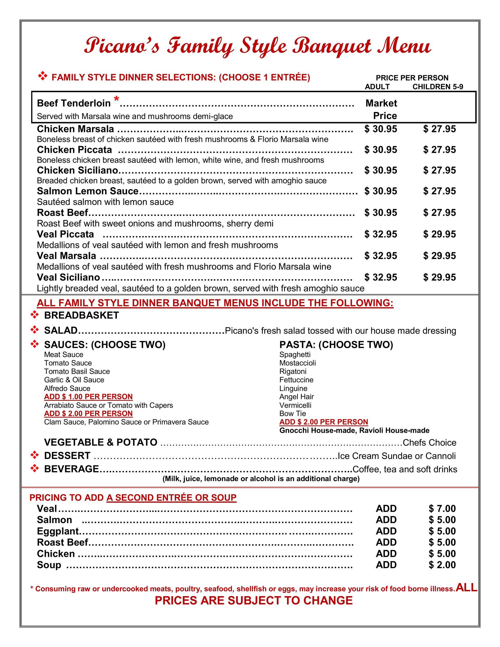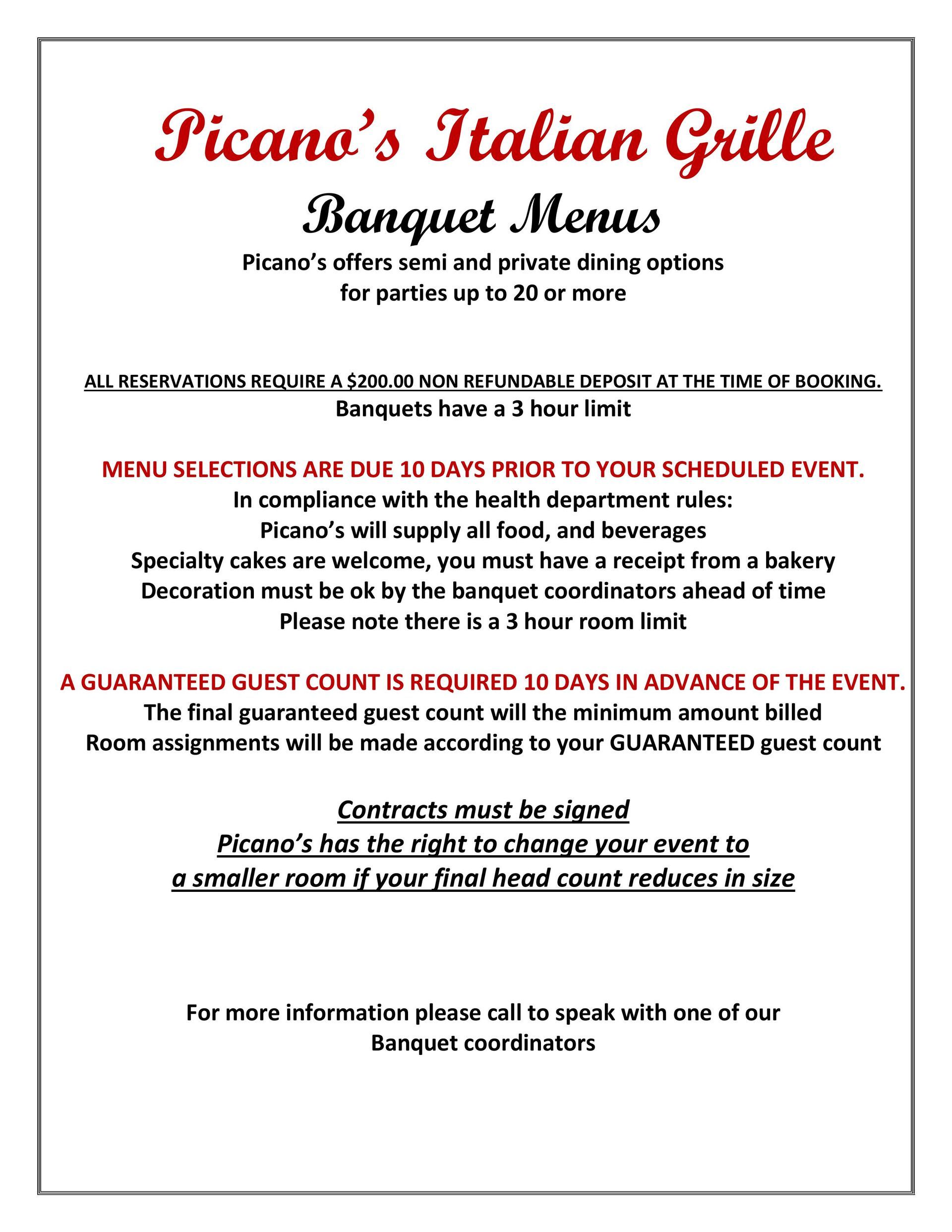 Picano’s offers semi and private dining options for parties up to 20 or more. All reservations require a $200.00 deposit at the time of booking. Banquets have a 3 hour limit. Menu selections are due 10 days prior to your scheduled event.